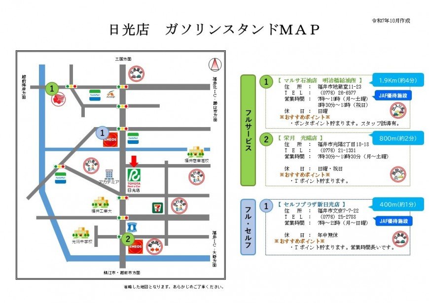 | <フル・セルフ1> セルフプラザ新日光店 TEL:(0776)25-2788 | |||||||